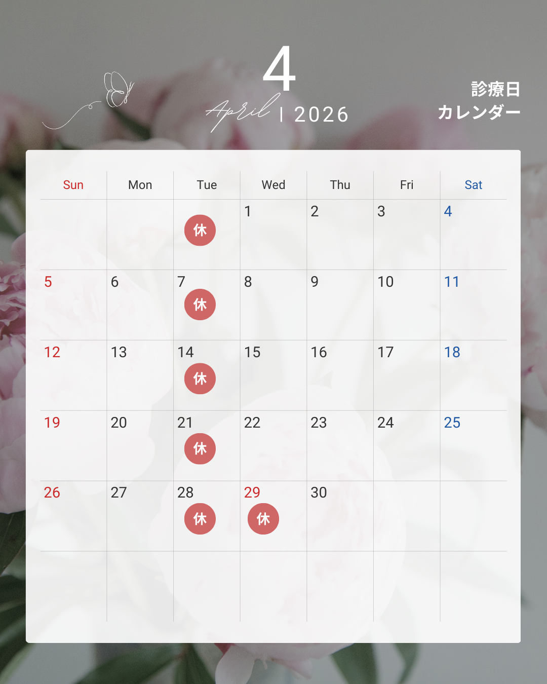 - 休診日:火曜、木曜午後、日曜午後、祝日