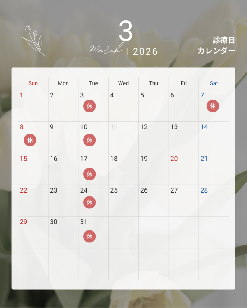 【3月の診療日について】 まだ寒い日が続いていますが、少し早めに3月の診療スケジュールをお知らせします🦷 院長セミナー参加のため、 3月7日(金)・8日(土)は休診となります。 ご予約の参考にしていただけると嬉しいです。 よろしくお願いいたします。