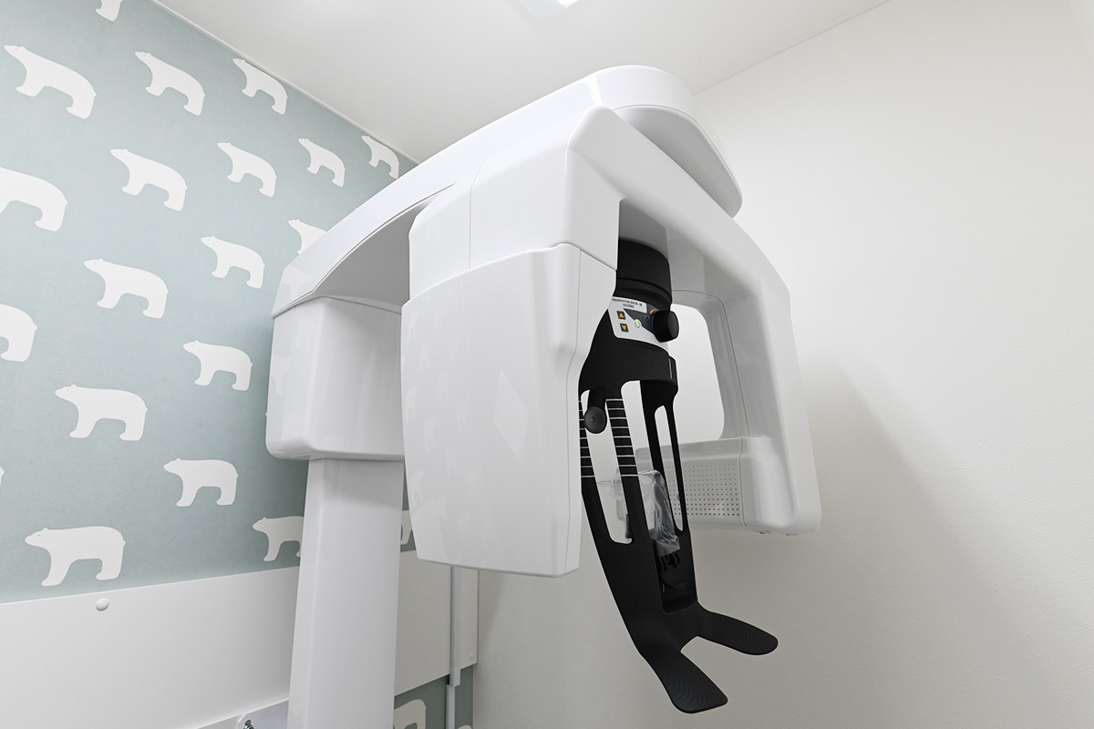 歯や顎の骨を立体的に映し出し、通常のレントゲンでは見えにくい部分まで詳しく確認できます。インプラントや親知らずの抜歯など、精密さが求められる治療をより安全・正確に行うことが可能です。
