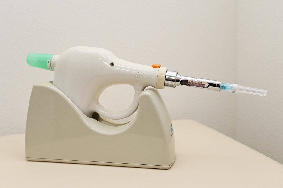 細い注射針を使用した電動注射器です。人間のコントロールよりもゆっくりとしたスピードで、痛みのないよう麻酔液を注入していきます。